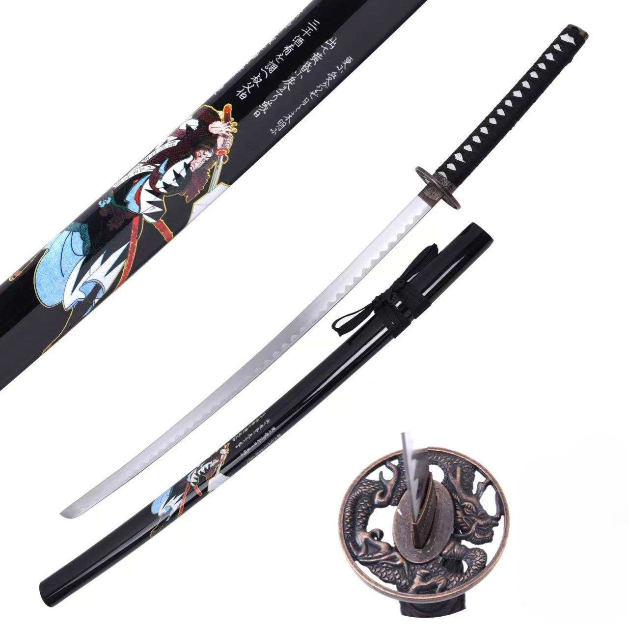 An unsharpened carbon steel swords consisting of one katana with scabbard.
