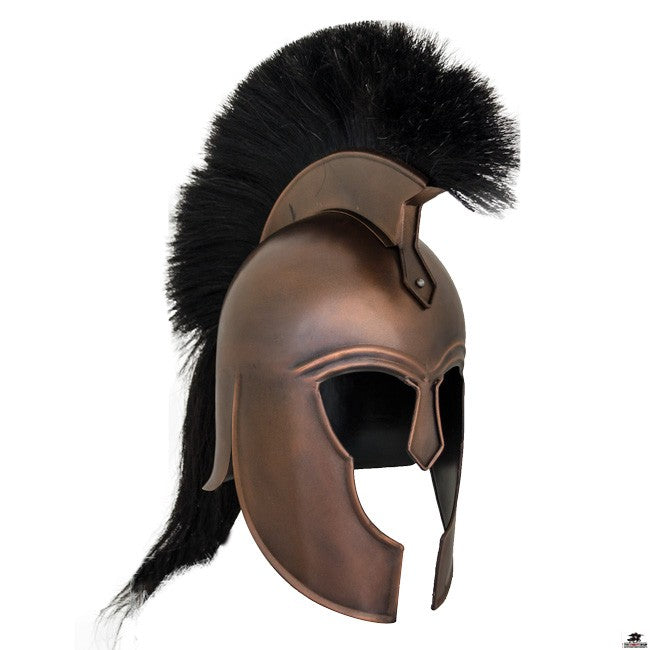 Our Myrmidon Helmet is inspired by the one worn by Brad Pitt as Achilles in the blockbuster movie Troy. It is hand crafted from 18 gauge steel and has a dark, antiqued finish. It features a real horse-hair crest and has a separate padded liner that can be glued in if required. Great for fancy dress or as a collectable conversational piece.