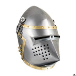 This Pigface Bascinet replica is hand crafted in polished steel and brass and has a removable pivoting visor like the originals. It features brass 'vervailles' for attaching a chainmail 'aventail' (not included) and an adjustable leather spider liner and buckled chin strap.