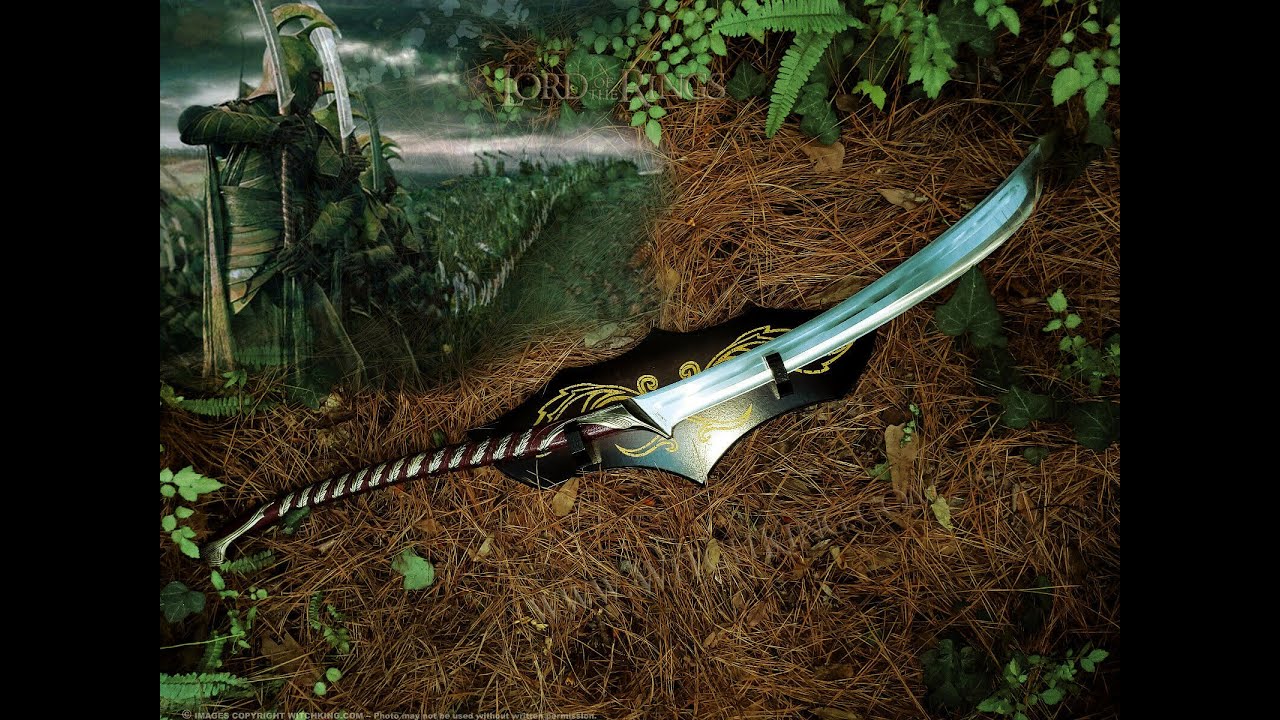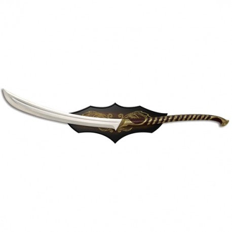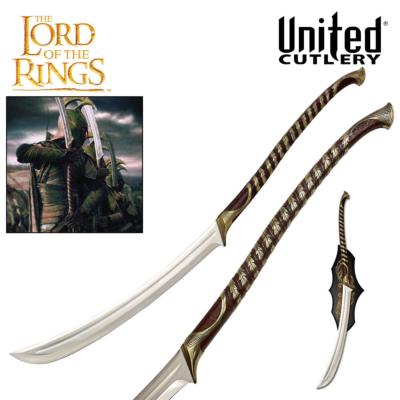 This officially licensed and superb quality reproduction item is an exact replica of the High Elven warrior sword that appears in the opening battle sequence of The Lord of the Rings movie trilogy. Measuring 49 3/4" overall, this elegant and deadly sword features a 24" tempered, 420 stainless steel, false edged blade. The precision cast metal handle offers a simulated leather grip accented with brass-plated Elven vine designs. This item includes a 23" x 9" x 3/4" wooden display plaque with silkscreen design and a certificate of authenticity.