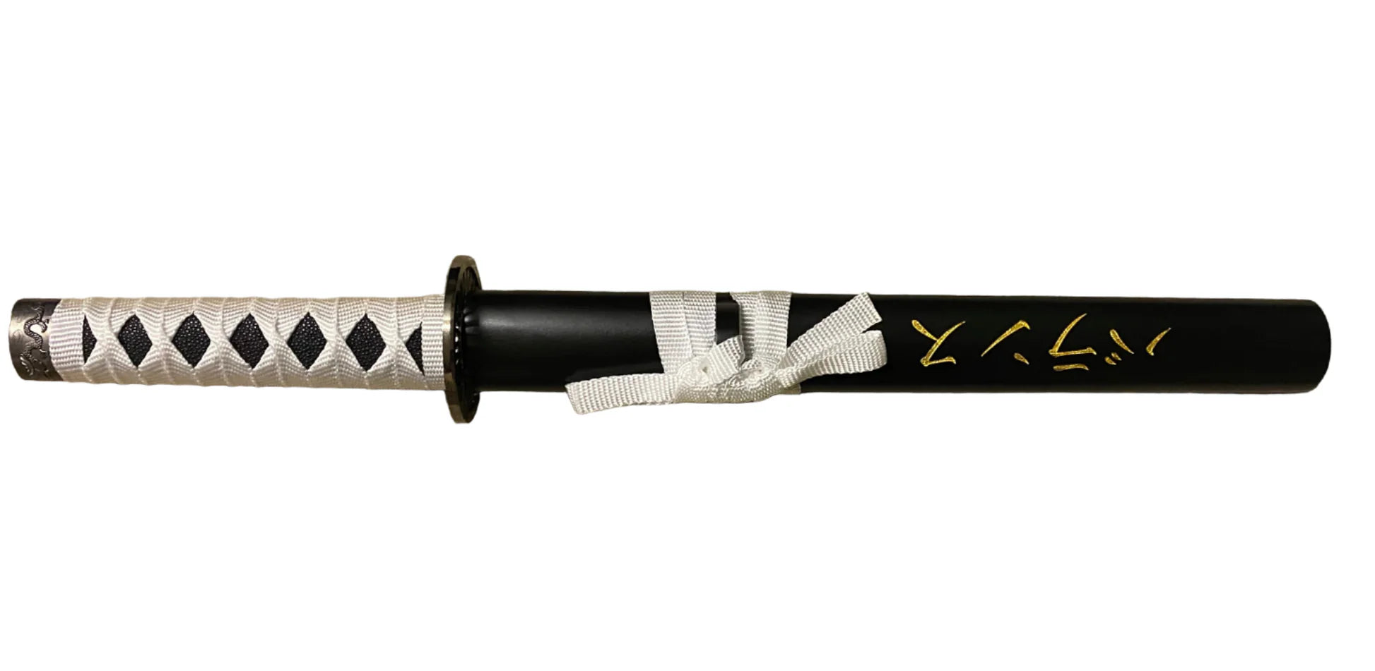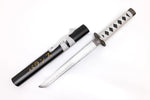 The black saya, accented with refined gold kanji-style markings and a white sageo, completes the look — making this tanto feel like a blade reserved for a respected warrior, scholar, or guardian rather than the battlefield. It’s a sword meant to be admired, contemplated, and displayed with pride.