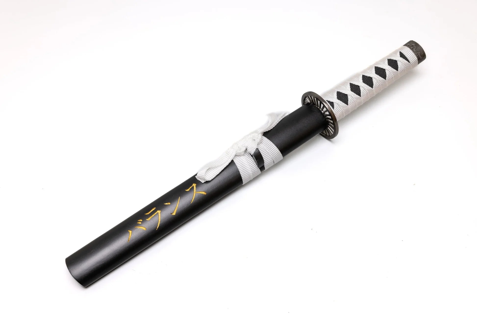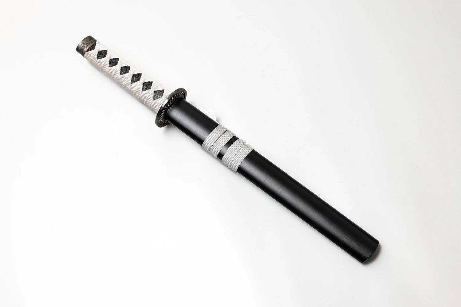 This piece features a clean, minimalist aesthetic inspired by classic Japanese blade design. The short blade showcases a subtle hamon-style wave pattern, adding visual depth without overpowering the sword’s understated elegance. Paired with a white tsuka wrap and traditional diamond patterning, Ryōken carries a calm, ceremonial presence rather than overt aggression.