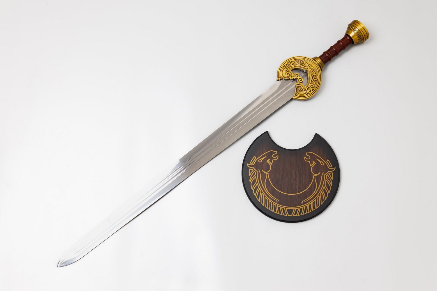 Theoden, King of Rohan, carries the beautiful sword Herugrim into battle. This full-metal, full size deluxe version comes with a wall display plaque