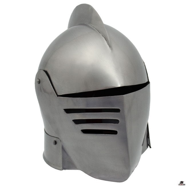 It is hand-crafted from 18 gauge steel and features a tilting visor, a fully padded leather liner, and an adjustable leather chin strap. Combine with a helmet stand for an amazing showpiece or wear it for cosplay, it’s perfect for both!